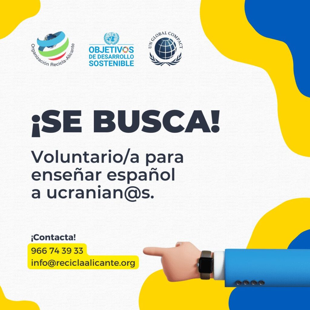 Desde la ONG Recicla-Alicante, necesitamos una persona voluntaria que hable ucraniano y español, para poder ayudar a los refugiados a aprender nuestro idioma.